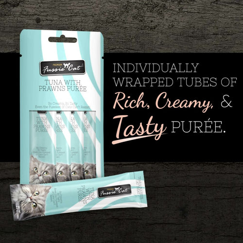 Fussie Cat Tuna with Prawns Purée is love at first lick. Creamy in texture and rich in taste, this indulgent, flavorsome puree will make even the Fussiest of Cats demand more! Fussie Cat Tuna with Prawns Purée is an easy-to-feed cat treat with essential vitamin E for your cat’s diet to support healthy skin and coat.