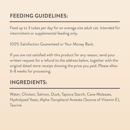 Feed up to 3 tubes per day for an average size adult cat. Intended for intermittent or supplemental feeding only.