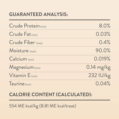 Water, Chicken, Salmon, Duck, Tapioca Starch, Cane Molasses, Hydrolyzed Yeast, Alpha-Tocopherol Acetate (Source of Vitamin E), Taurine.